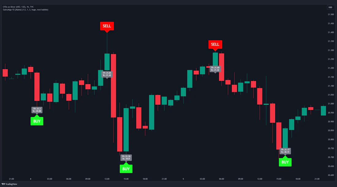 Trade using simple BUY & SELL signals, which never repaint or lag, and grow your trading experience with proven consistency of GainzAlgo.